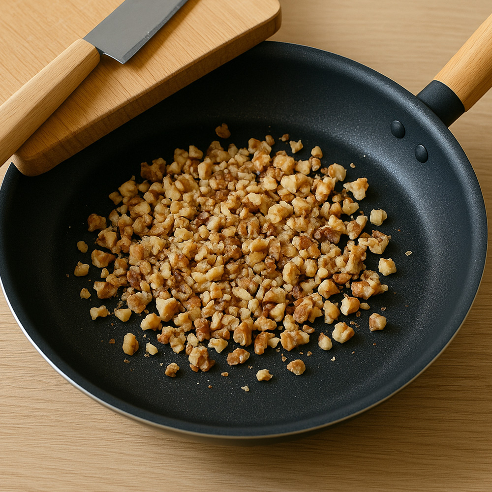 くるみを粗く刻み、フライパンで軽く乾煎りして香ばしさを引き出します。